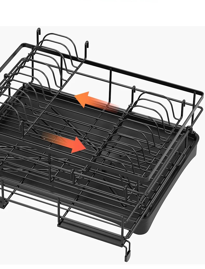 Le système de drainage fonctionne par gravité naturelle. L'eau s'écoule automatiquement sans que vous ayez à vider quoi que ce soit. Vous posez votre vaisselle mouillée le soir. Le lendemain matin, tout est sec et rangé. Voici ce qui rend ce système si pratique :